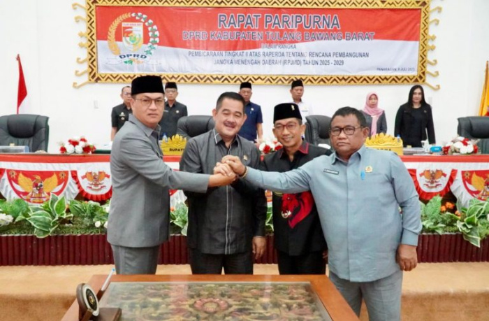 Tubaba – Dewan Perwakilan Rakyat Daerah (DPRD) Kabupaten Tulang Bawang Barat (Tubaba) menggelar Rapat Paripurna dengan agenda Pembahasan Tingkat II (dua) Persetujuan Bersama Rancangan Peraturan Daerah (Ranperda) RPJMD Tahun 2025–2029. Rapat berlangsung di Ruang Rapat Kantor DPRD setempat, Rabu (9/7/2025).
