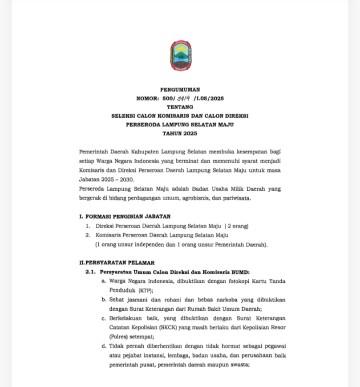 SERAMBI LAMPUNG – Pemerintah Lampung Selatan mulai umumkan seleksi calon komisaris dan direksi Badan Usaha Milik Daerah (BUMD) Perseroda Lampung Selatan Maju (LSM), Selasa, 30 September 2025.