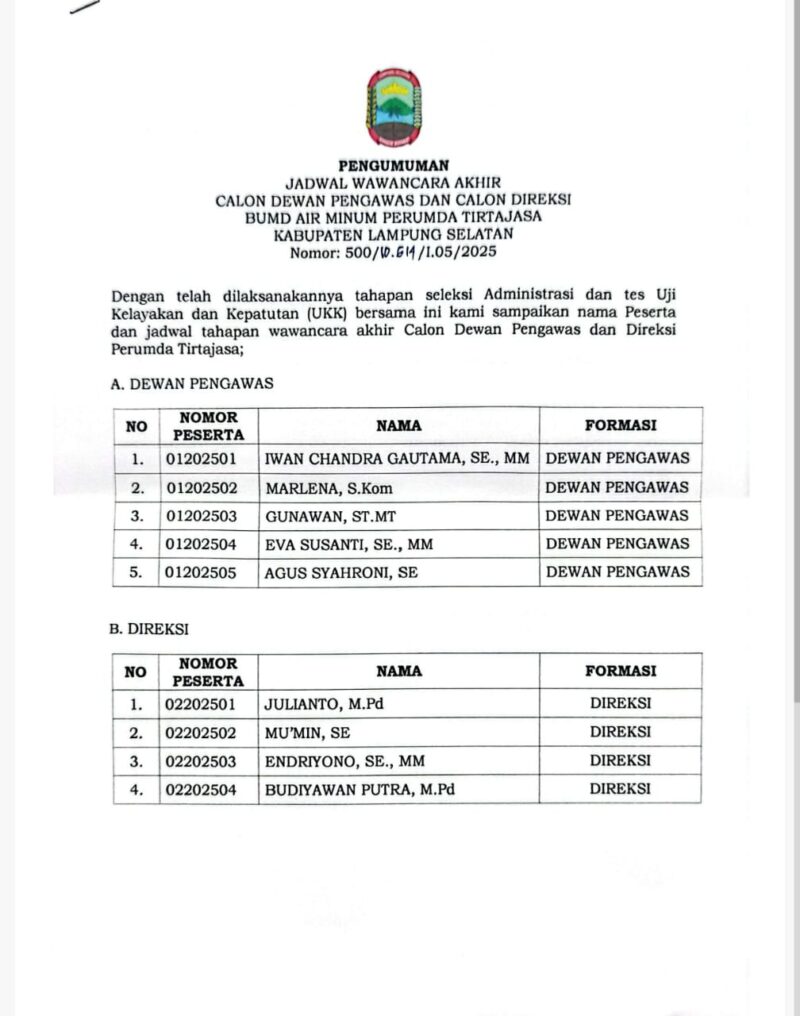 SERAMBI LAMPUNG – Lima calon dewan pengawas dan empat calon direksi Perumda Tirta Jasa Lampung Selatan ikuti wawancara akhir, Senin, 22 Desember 2025.